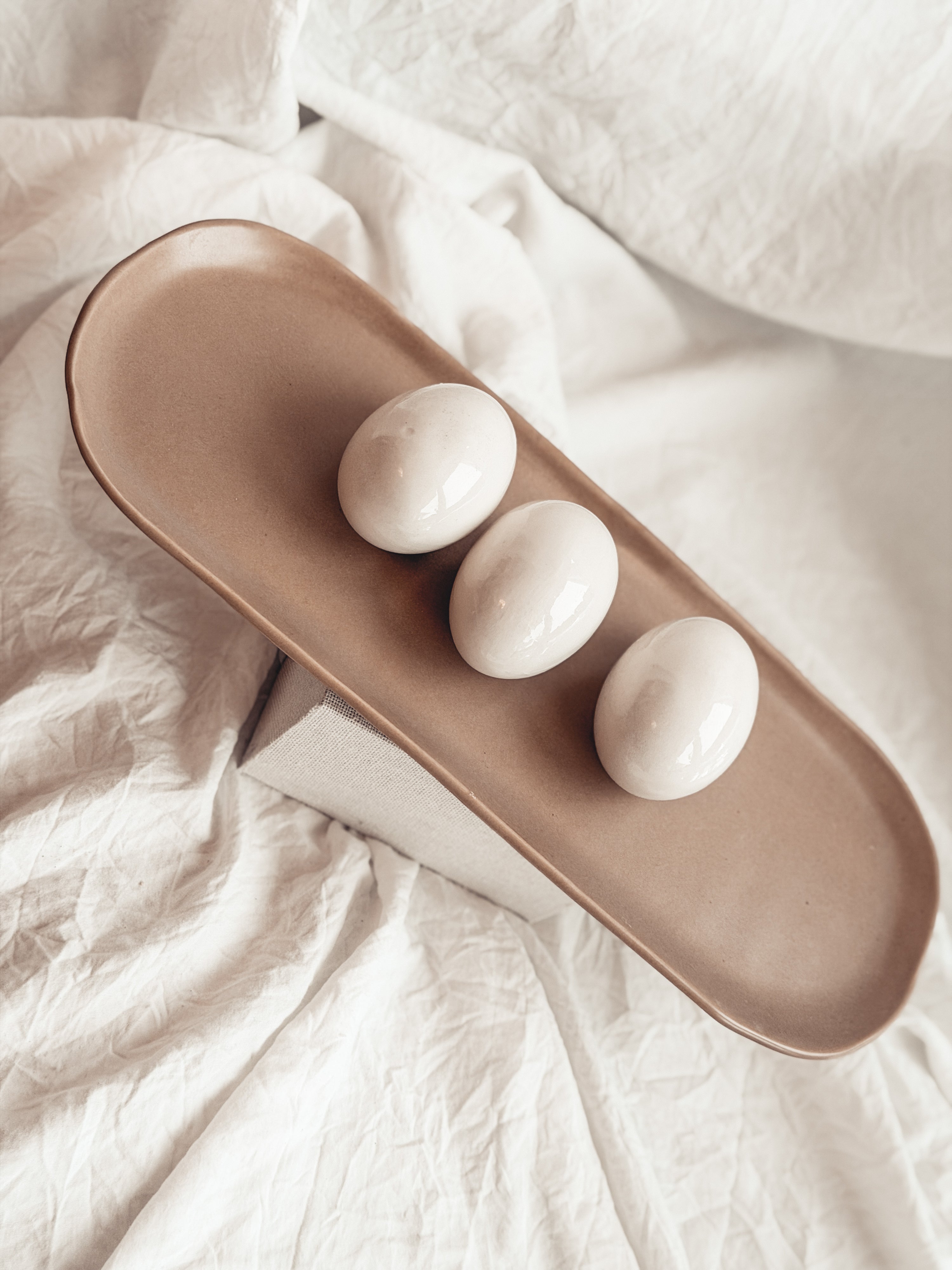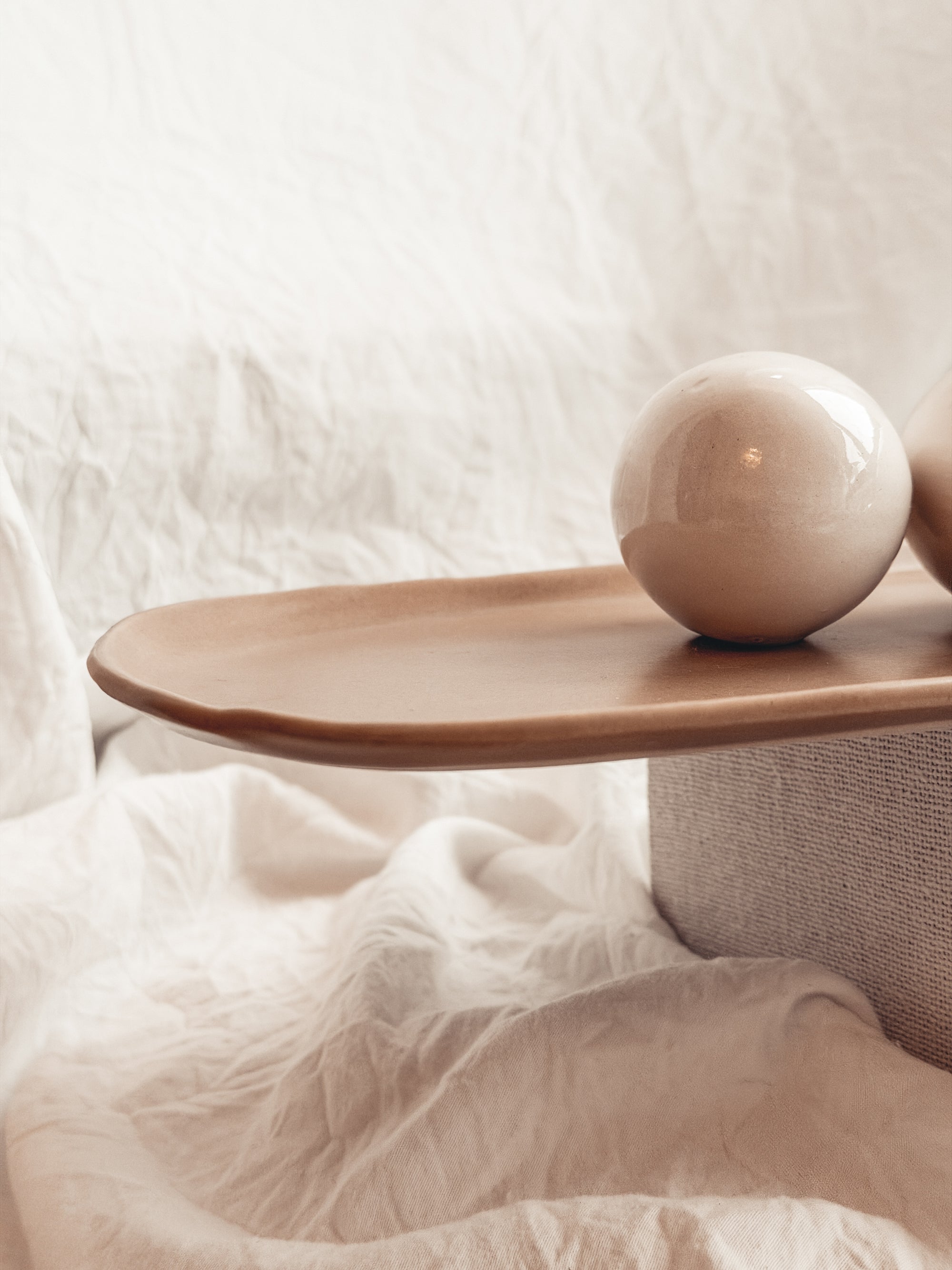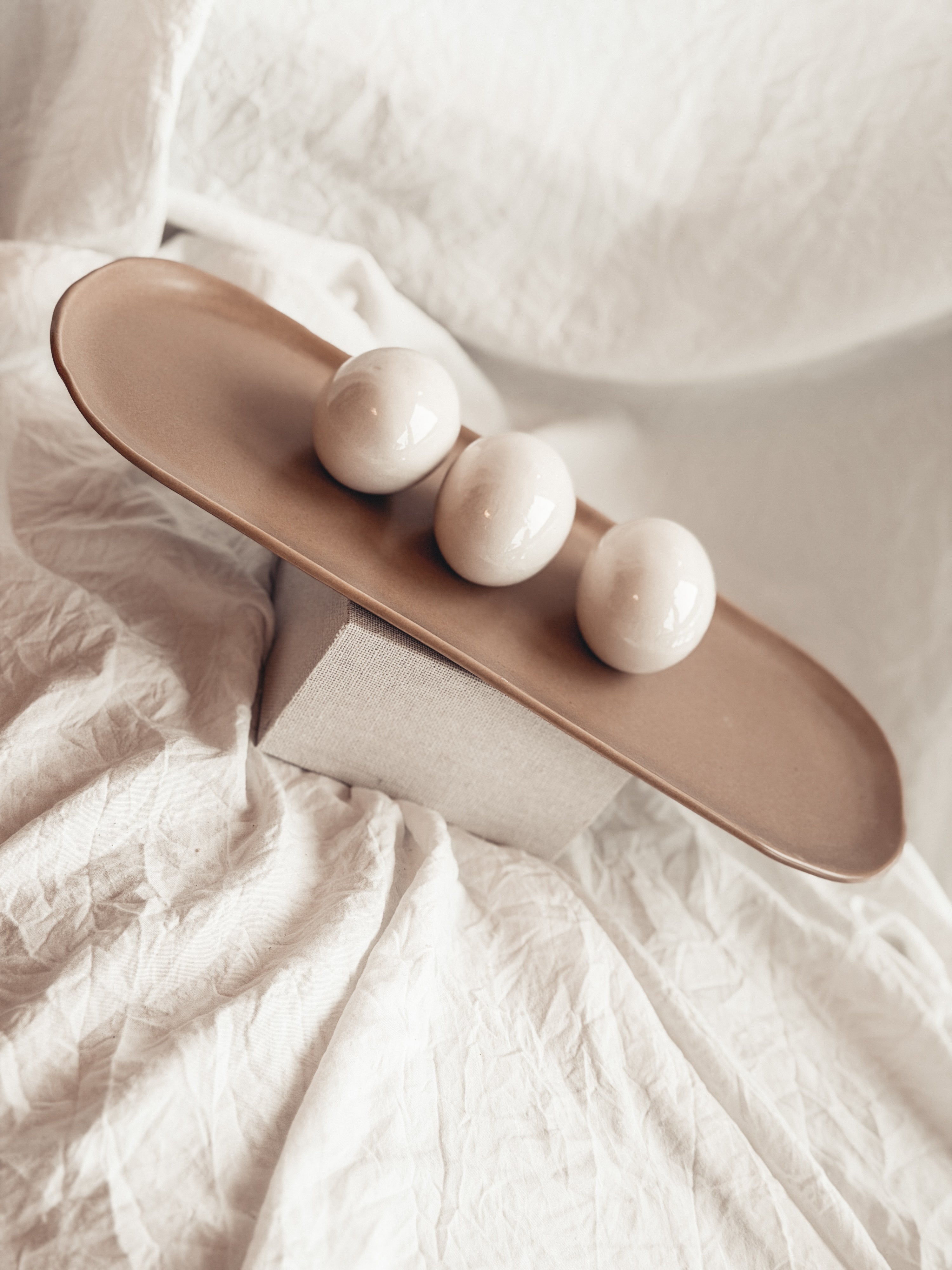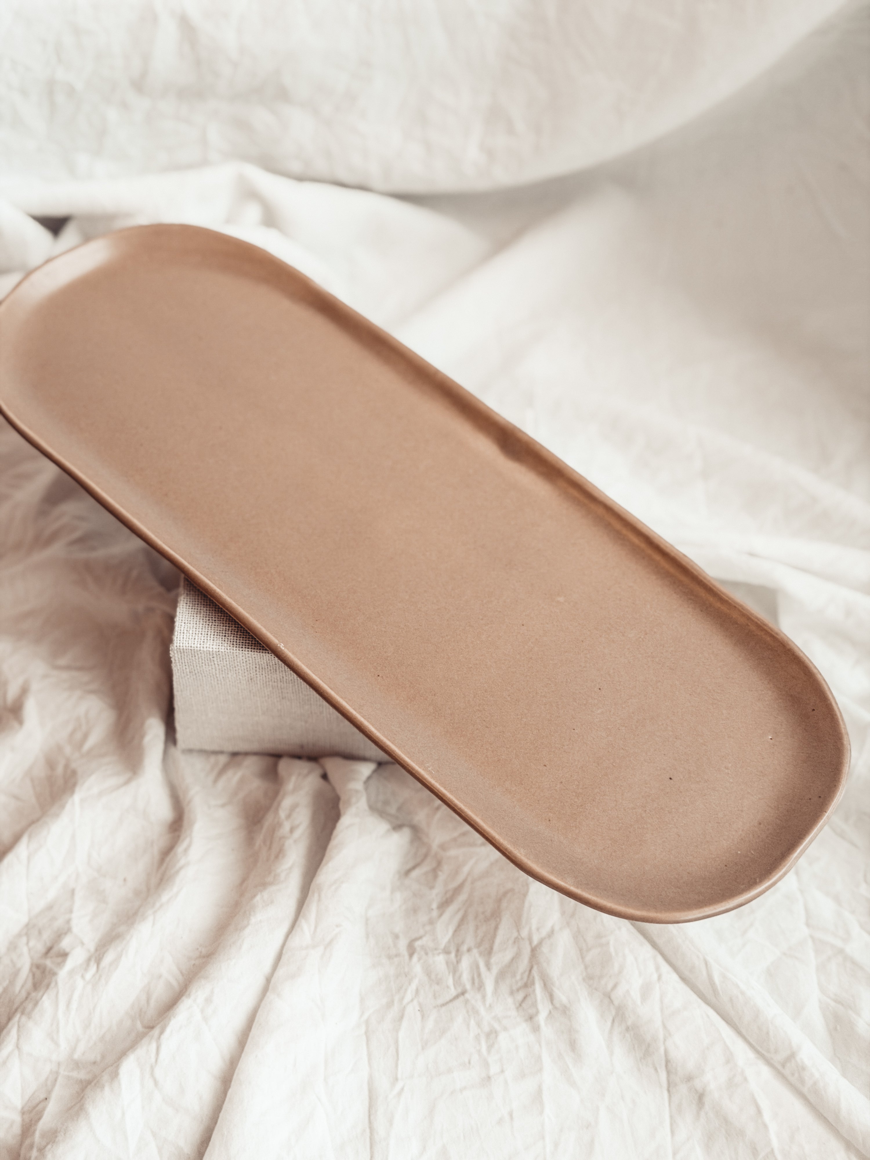 This long tray is made of durable cream stoneware with a walnut-colored, semi-matte glaze. Its size and shape make it ideal for holding trinkets, bottles and scrubbers near sinks, counters, and other surfaces.