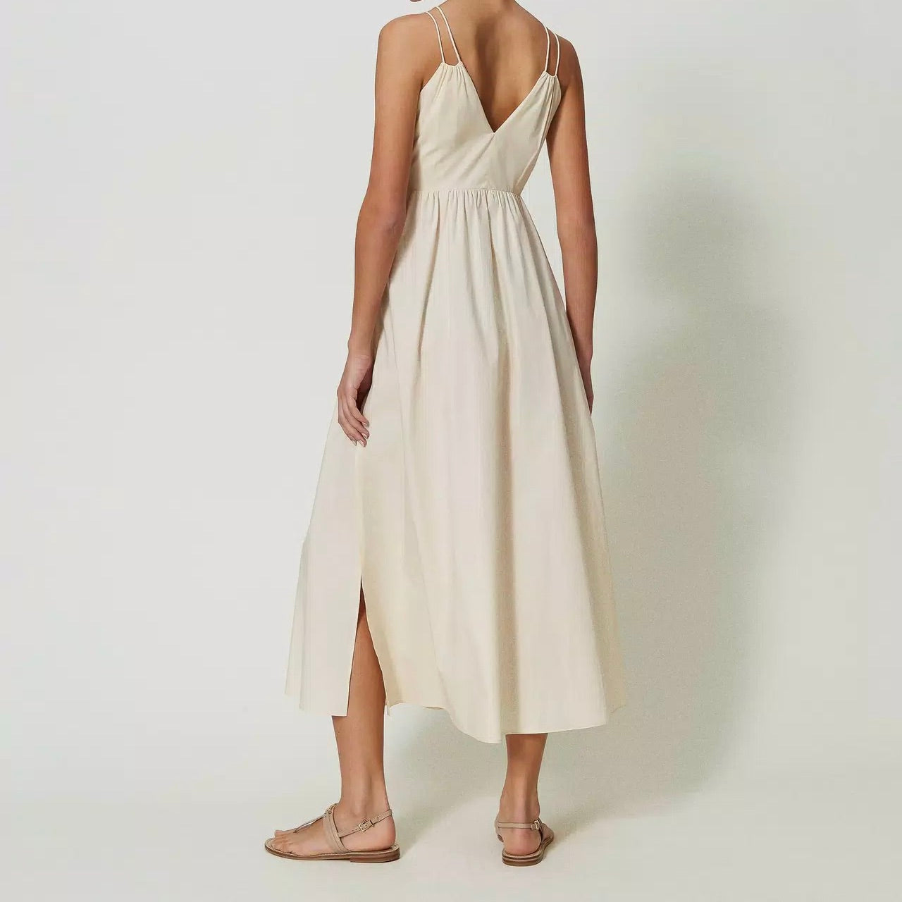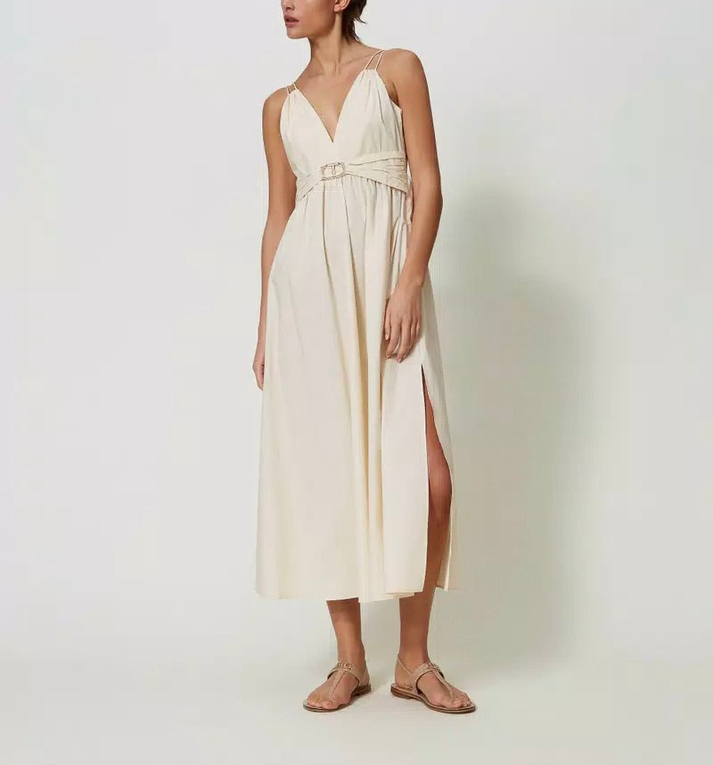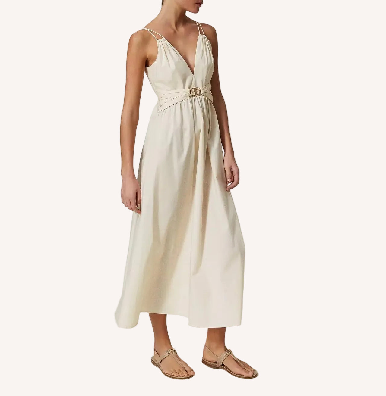 This Twinset Cotton Poplin Dress in Parchment is a must-have for any wardrobe. Made from stretch cotton poplin, it features a feminine silhouette with a gathered waistband and a gold-tone metal Oval T buckle. The versatile design includes a plunging V neck, double thin shoulder straps, and a side zip closure. Perfect for both daytime wear and special occasions.