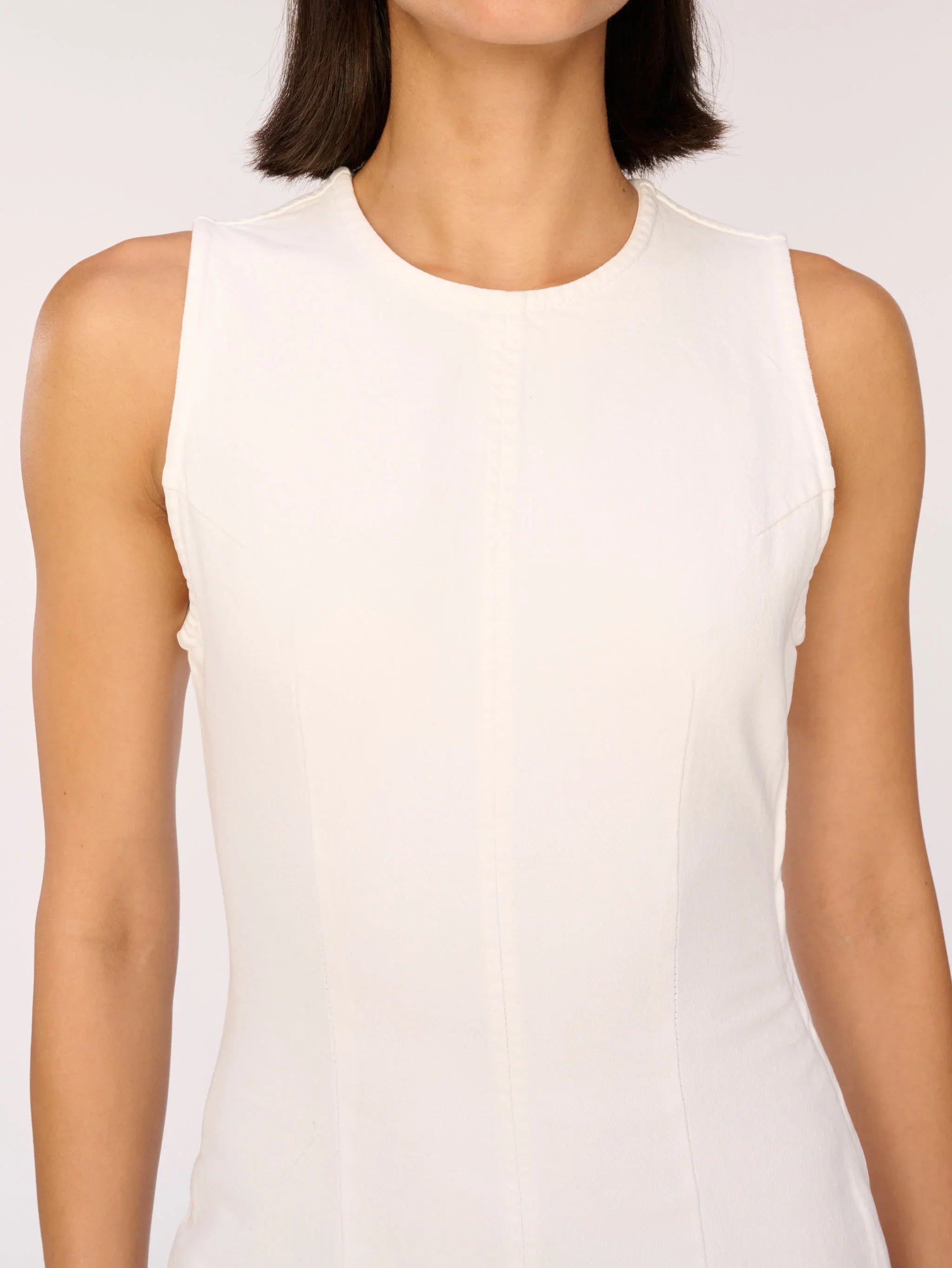 Esme is a form-fitting, sleeveless midi dress with hidden zippers at the back neck and side. It features concealed matte silver zippers, tonal stitching and a wide clean hem.