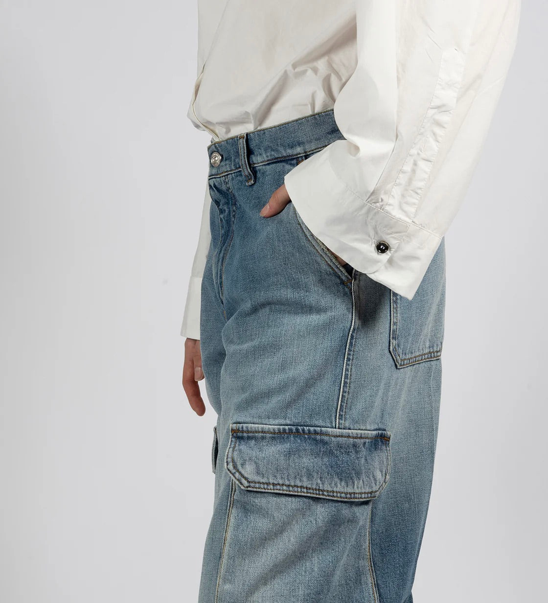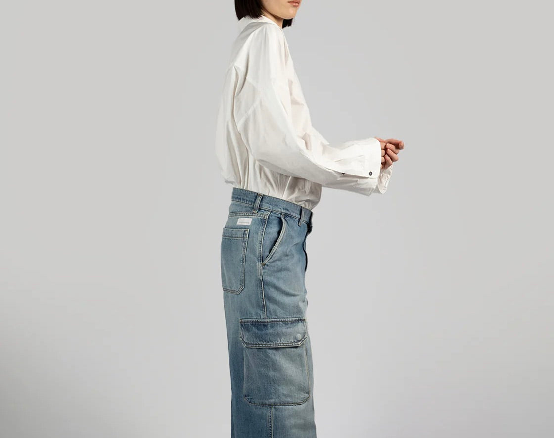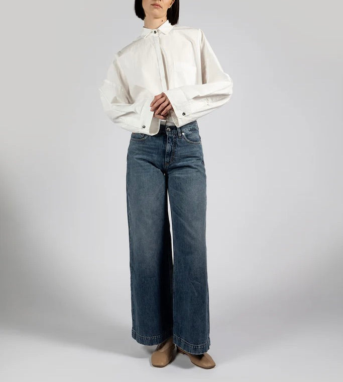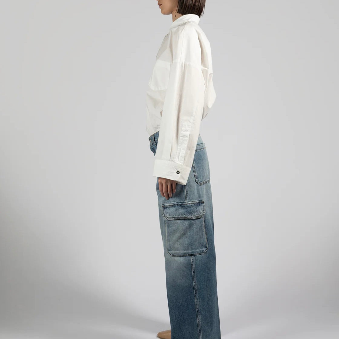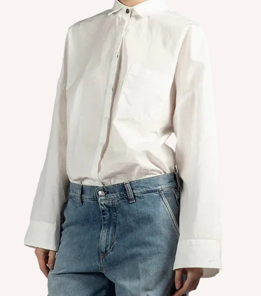 Long, wide-sleeved oversized shirt in silk and wool crepe; front pocket, fastening with horn buttons; logo label on the back.