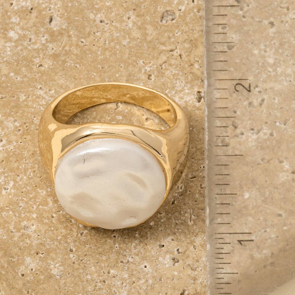 This ring carries a charming pearl top signet band design. This item is perfect for adding some charm to any outfit.
