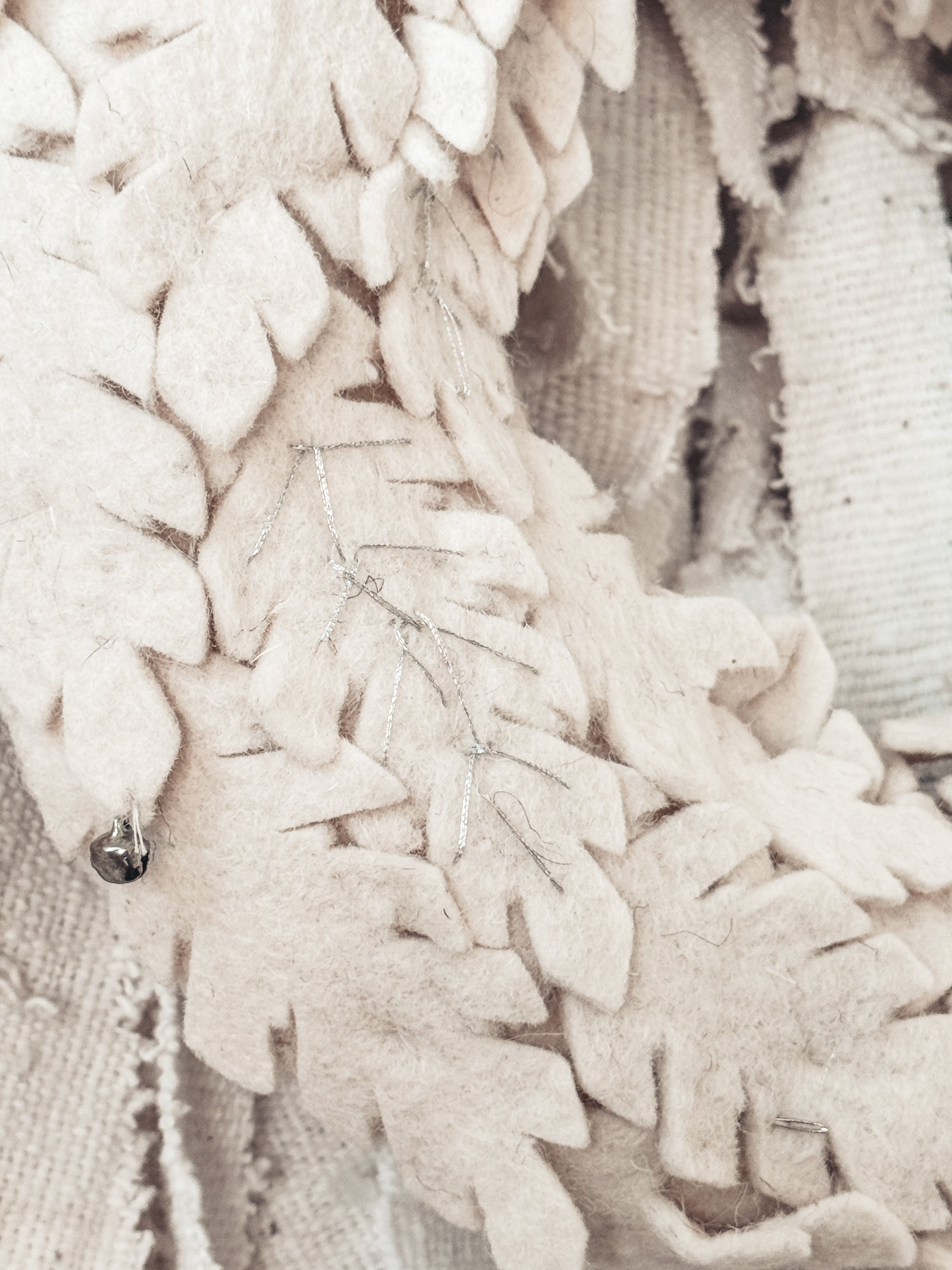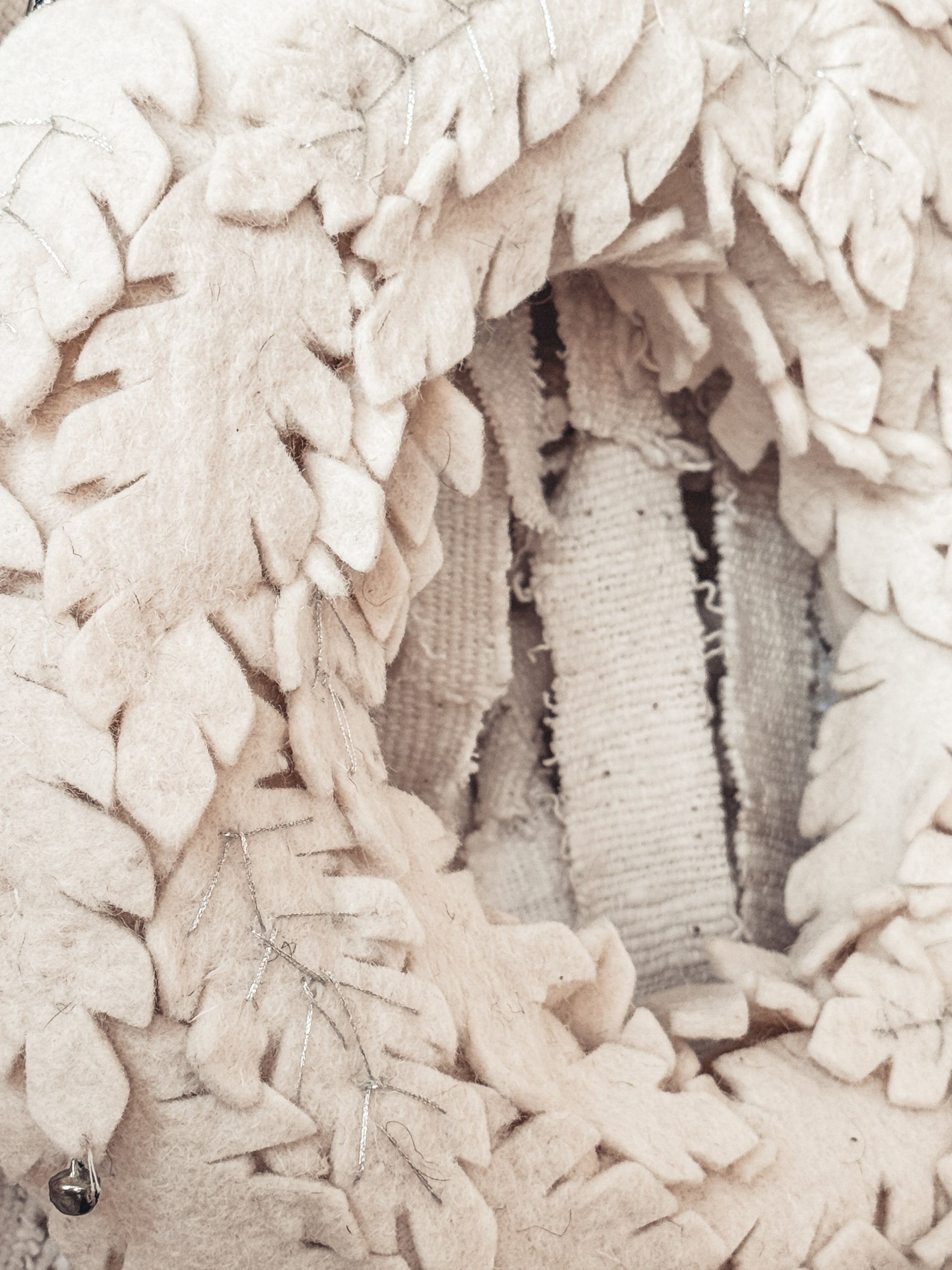 12” Diameter felted wool wreath featuring felt leaves adorned with silver bells. Hanging is made easy with the 6” felted loop at the top!