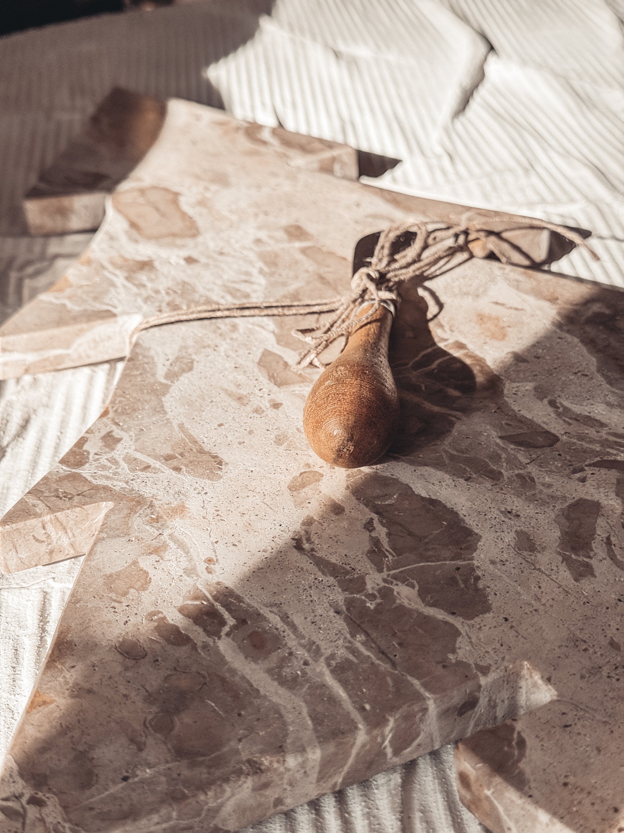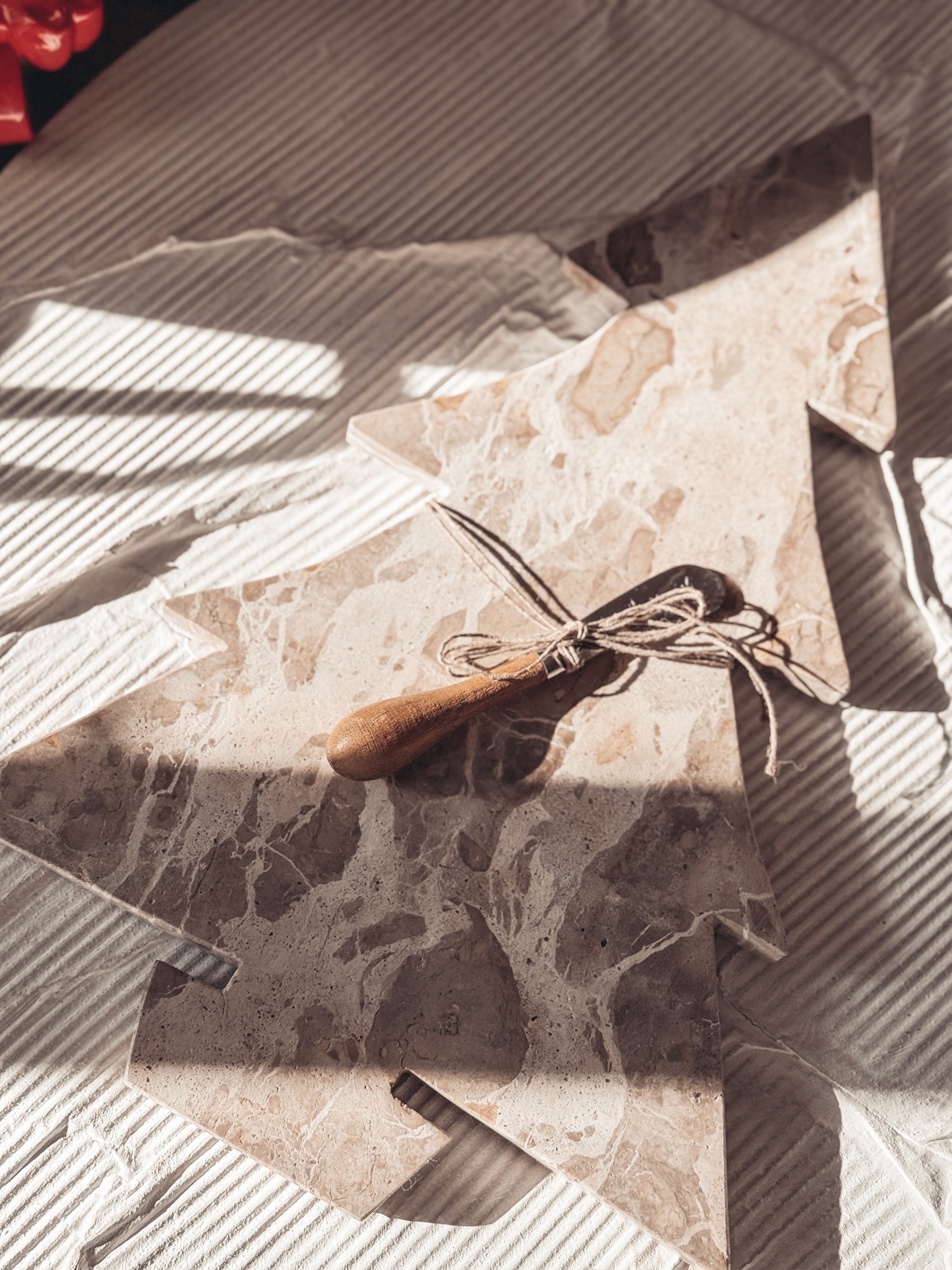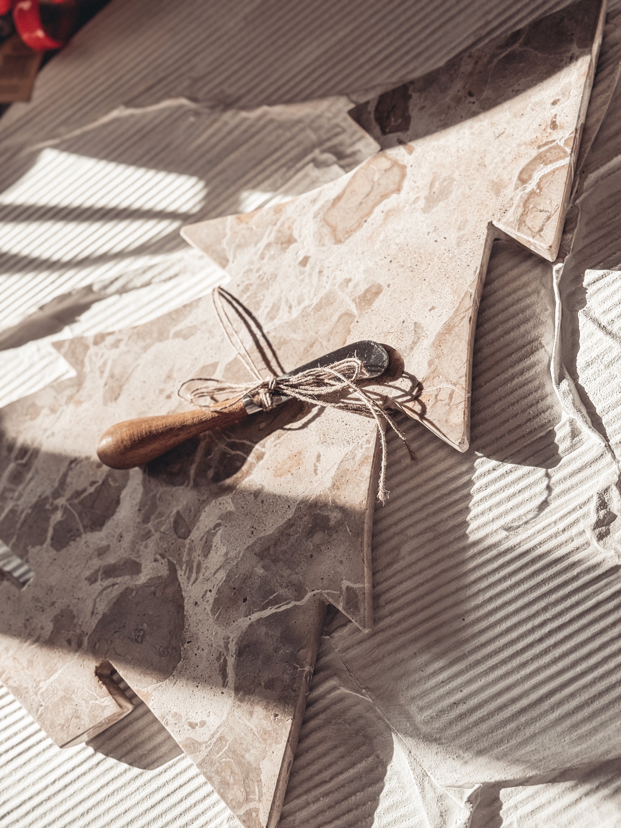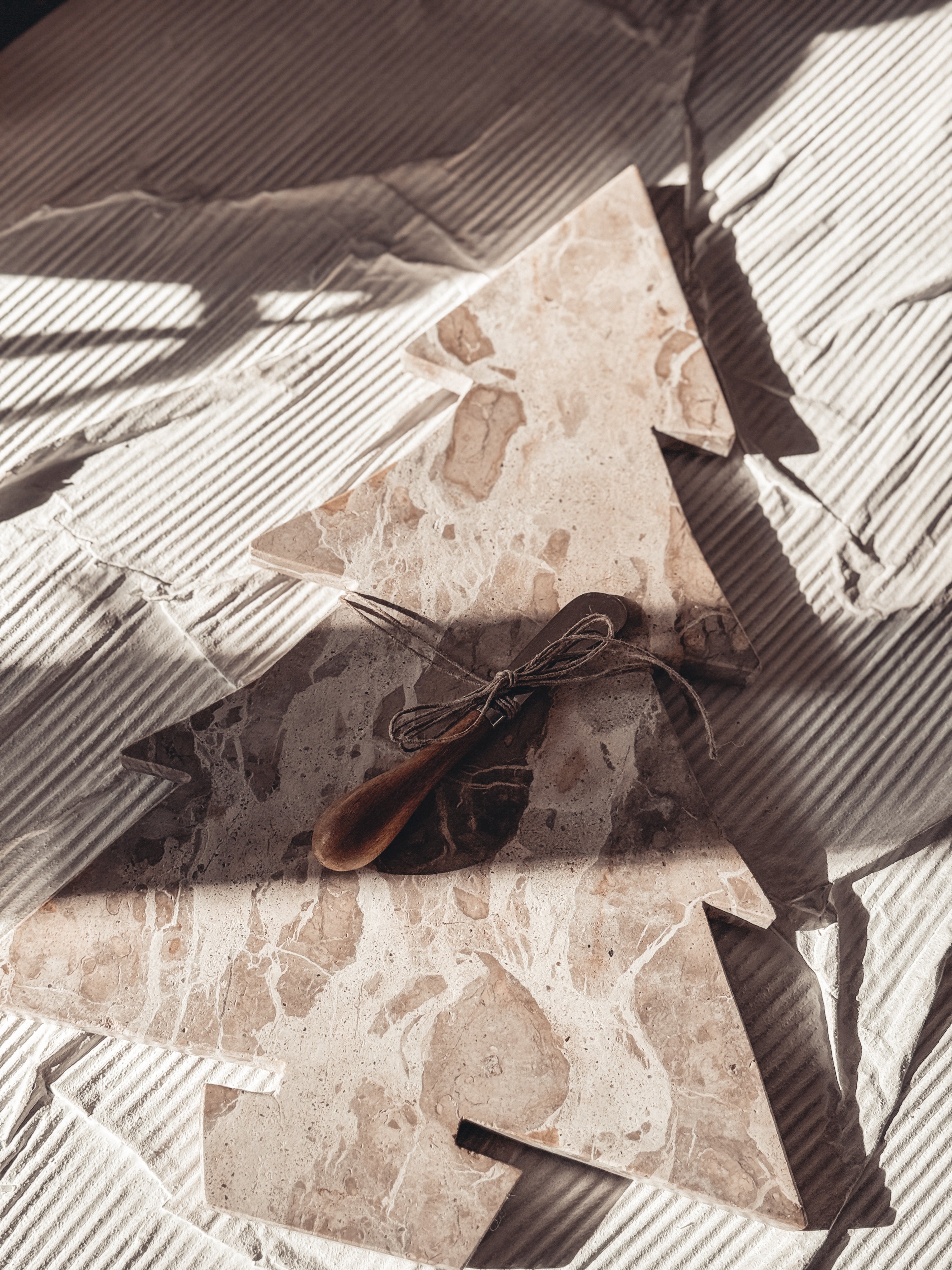 Marble Tree Shaped Cheese/Cutting Board w/ Stainless Steel & Mango Wood Canape Knife, Buff Color & Natural, Set of 2 Tied w/ Jute (Each One Will Vary)