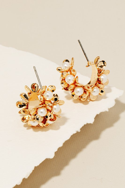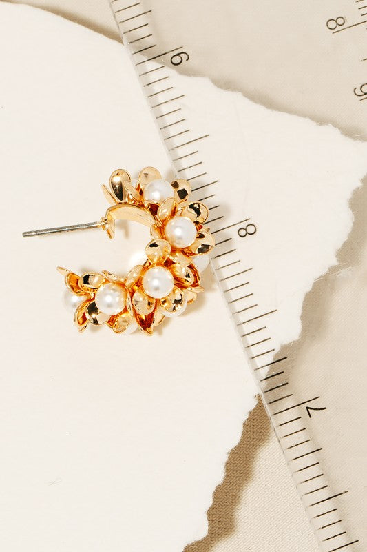 Perfect for any occasion, from casual to formal, this pair of hoop earrings flaunts a luxurious pearl beaded flower design. Add a touch of glamour to your wardrobe with this versatile accessory, perfect for enhancing the elegance of any look. This pair of hoop earrings is made with 50% Steel and 50% Acrylic.