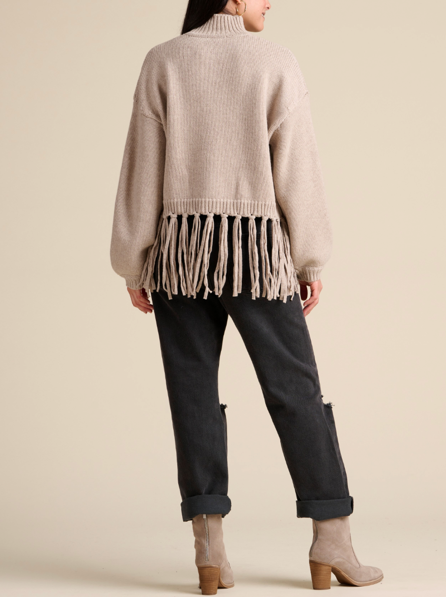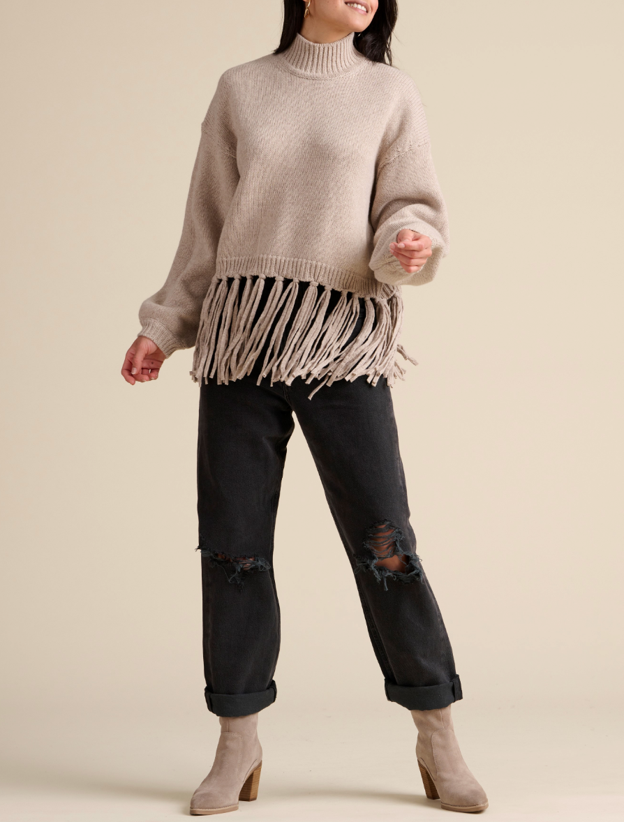Get into the holiday spirit with the festive Riley Fringe Sweater. Made from a jersey knit, its very boxy fit is cropped with extra long fringe that goes all the way around the hem. We topped it with a mock neck and slouchy sleeves marked by elevated rib detailing.