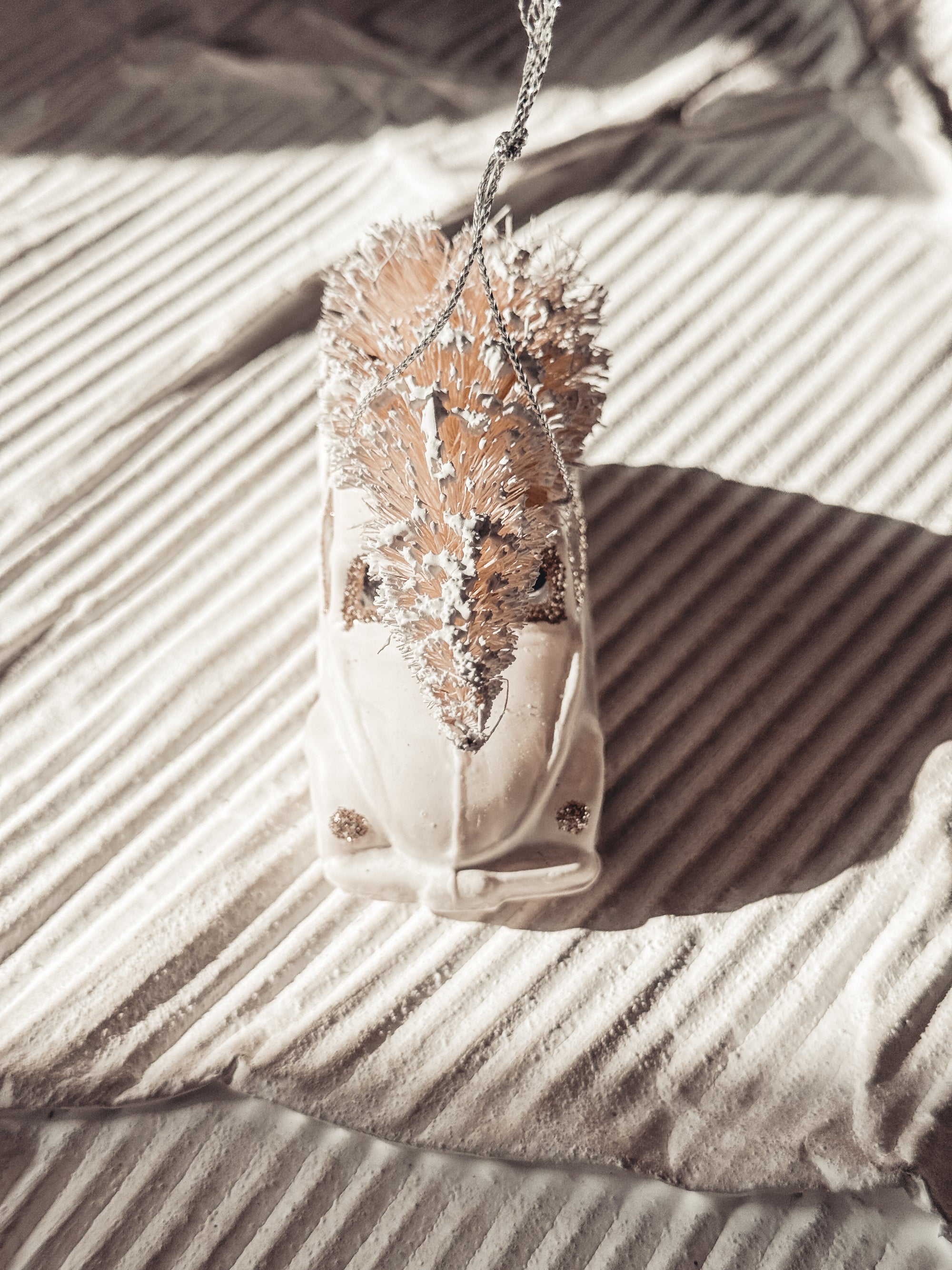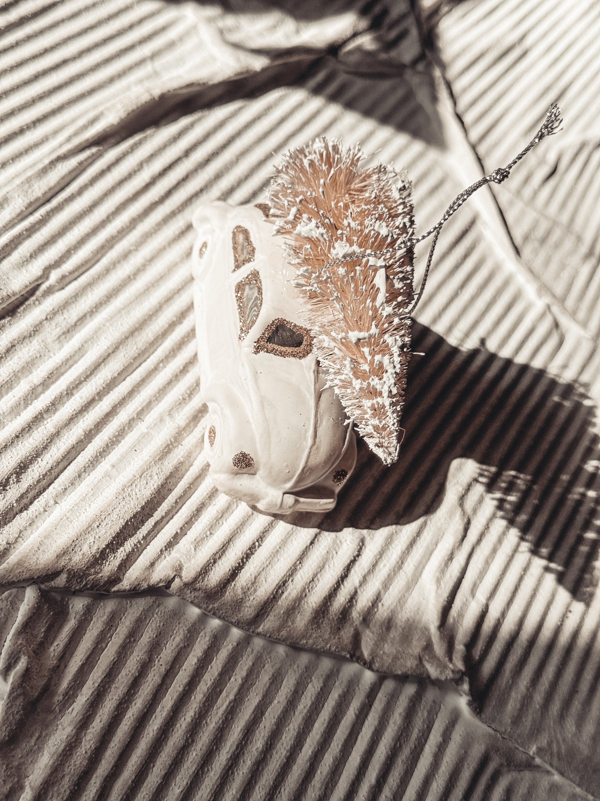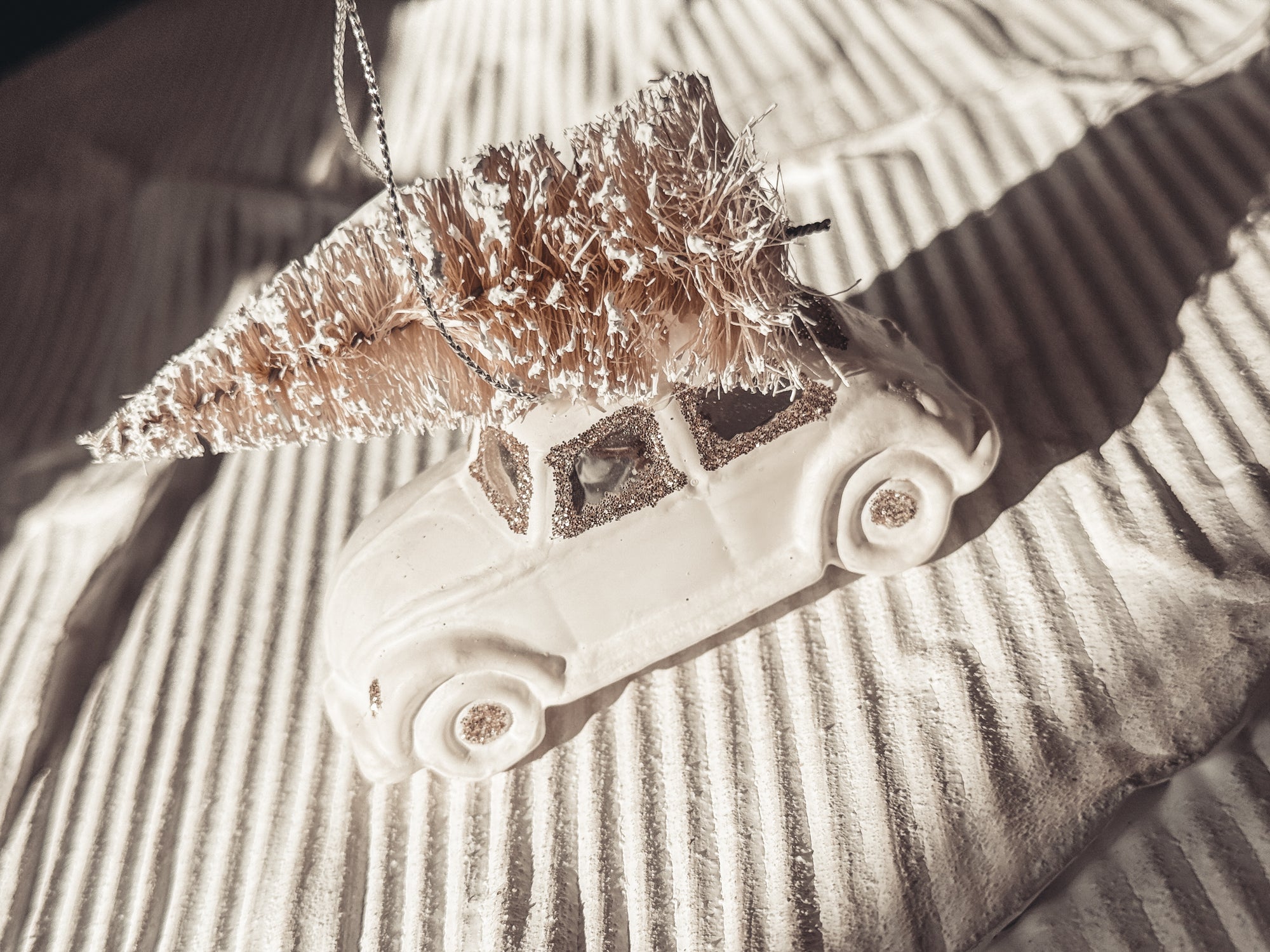4"W x 2-1/2"H Glass Car Ornament w/ Sisal Bottle Brush Tree, Cream Color & Gold Finish